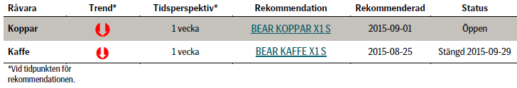 Förra veckan konstaterade vi att vi var nöjda så långt med vår position och rekommenderade att stänga den – givet att man inte trodde att det fanns ytterligare nedsida kvar på grund av just en svagare realkurs. Detta med förbehållet att vi skulle stänga positionen så fort kursen började gå åt fel håll. Därför stängde är positionen nu stängd, men för den som nu tror att marknaden har överreagerat åt det positiva hållet vad gäller realkursen kan man förstås köpa nya bear-certifikat. I avsaknad av fundamentala faktorer för kaffet blir detta dock uteslutande en valutaspekulation som vi inom ramen för Råvarubrevet lämnar därhän. Vi fortsätter dock att bevaka priset på kaffe – en av våra mest populära råvaror att handla!