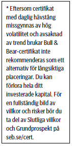 En placering i certifikat och warranter är förknippat med risker. Du kan förlora hela ditt investerade kapital. Läs mer om riskerna i SEB:s offentliggjorda Grundprospekt för certifikat- och warrantprogram på seb.se/cert eller seb.se/mini.