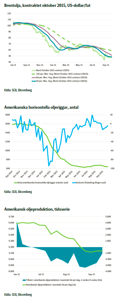 När det kommer till oljan ser vi flertalet faktorer som ger risk på nedsidan: Dels är globala lager fortsatt mycket stora men vad som är mycket viktigt att ta med i ekvationen är den potentiella produktion som kan komma från borrade källor i USA som ännu ej är tagna i bruk. Vidare går vi nu in i en period med säsongsmässiga underhåll av raffinaderier, vilket minskar efterfrågan på olja, liksom en ökande produktion av olja från Nordsjön. Därefter kommer vi att röra oss in i en period också av säsongsmässigt lägre efterfrågan under första kvartalet 2016. Sammantaget anser vi att det är svårt att tro på ett fundamentalt högre oljepris under de närmaste 6 månaderna.