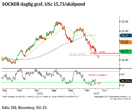 Denna vecka har vi Fed’s räntemöte ikväll som dock inte lär ge några nya signaler. Vi har också andra rundan av det franska presidentvalet på söndag men så som opinionsundersökningarna ser ut så bör Macron inte ha några större problem med att vinna. Sämre bilförsäljning i USA under april kan vara en negativ faktor för vissa metaller och så är också den allt tajtare likviditetssituationen i Kina där man nu allt mer frenetiskt försöker pressa skuggbanksektorn och spekulanterna. Vi har även fått en del PMI statistik som varit lite svagare, dock fortfarande på höga nivåer. Snösstormen i den amerikanska mellanvästern har sannolikt förstört mycket av höstvetet, framför allt i Kansas, men även i omkringliggande delstater, vilket fick priset på vete och framför allt vintervete att rusa.