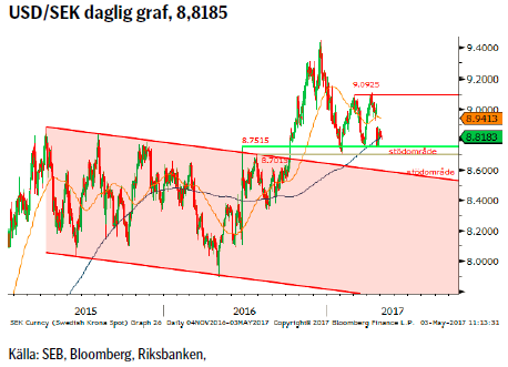 Dollarn fortsätter att trampa vatten och gapet ned som skapades över helgen vid första omgången av det franska presidentvalet är fortfarande öppet vilket tolkas negativt. Dessutom så har det kommit mer positiv europeisk statistik och mer negativ amerikansk sådan vilket givit stöd åt €/$. En positiv faktor som nu klingat av är utdelningssäsongen som i år inte givit mycket till synbar effekt. Det amerikanska skuldtaket har nu temporärt höjts varför problemet kommer tillbaka i och med utgången av budgetåret dvs. 30/9-17.