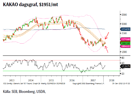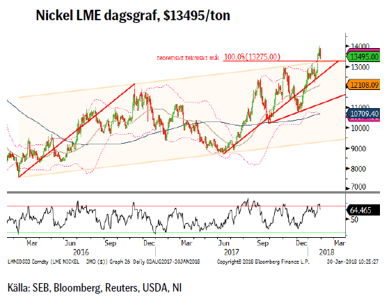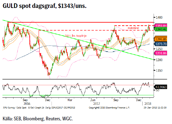 Ekonomiska indikatorer fortsätter i allmänhet att visa styrka med inte minst snabbestimatet över euroområdets sammanlagada inköpsindex ordenligt över förväntan. Tyska inköpschefsindex noterade sin 57:e raka månad av tillväxt. Till följd av de positiva tongångarna, Feds minskning av sin balansräkning och ECBs halvering av obligationsköpande fortsätter obligationsräntorna att stiga. Som förväntat rörde vare sig Norges Bank eller ECB räntan i torsdags. ECB var dessutom förvånande svag i förhållandet till den allt starkare euron vilket fick denna att stiga till nytt tre års högsta mot dollarn. Det uppkommande valet i Italien i början av mars bör dock för närvarande motverka en allt för högtflygande euro, som dessutom är ordentligt överköpt (den spekulativa långa nettopositionen på sin högsta nivå sedan euron introducerades). Federal Reserve håller möte tisdag/onsdag men ingen ränteförändring bör ske denna gång, dock är detta Yellen’s sista möte och från och med imorgon tar den nye Fed-chefen, Jerome Powell, över. Kallt väder ställer till det på många ställen. I USA så har det kalla vädret tillsammans med brist på snö skadat vintervetet i de södra delarna av odlingsområdet. Samma riskerar Ryssland att råka ut för. Kyla och snö gör att det är svårt att få fram kol i Kina varför priset stigit kraftigt (och om ett par veckor stänger i princip Kina för nyårsfirande). Japan har drabbats av den kallaste januari på mer än 40 år vilket ökar behovet av LNG (flytande naturgas) import.