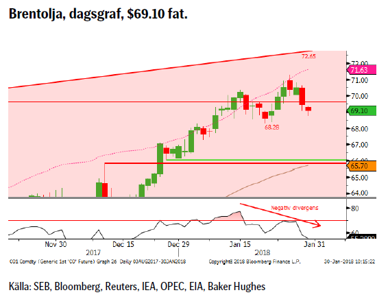 – Tekniskt så riskerar vi nu en negativ divergens dvs. vi har en ny topp i oljepriset men än så länge en lägre topp i RSI.