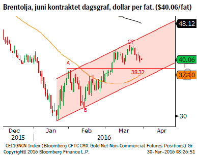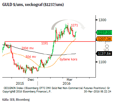 - Den långa nettopositioneringen gör att marknaden är sårbar för ett fallande pris (stopp loss försäljningar).