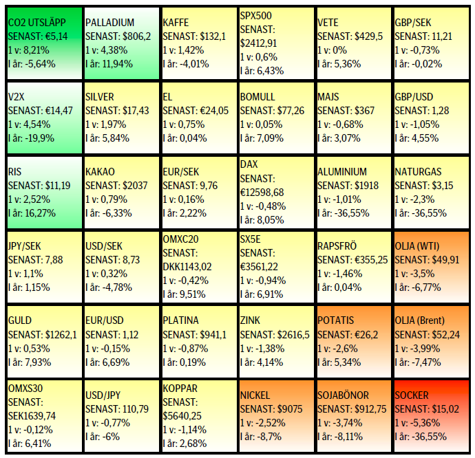 Råvaror: Så har vi då klarat av OPEC mötet och de signaler som sänts ut från framför allt Saudiarabien och Ryssland visade sig materialiseras i en nio månaders förlängning av avtalet från 30:e november. Att man valde att förlänga till utgången av första kvartalet 2018 och inte bara fram till årsskiftet 2017/18 beror sannolikt på att säsongsmässigt så är första kvartalet relativt svagt och att man därför försöker undvika lageruppbyggnad. Marknadens negativa reaktion visar dock att man sannolikt tolkat Saudiarabiens uttalanden om att göra vad som behövs (”whatever it takes”) som ev. större nedskärningar och inte bara en förlängning, vilket fick priset på fall när så inte blev fallet. Den svagare dollarn och ökad risk för en konflikt på Koreahalvön har lyft guld och silverpriset. Basmetallerna har handlat blandat med koppar och nickel fortsatt på den svaga sidan medan aluminium handlats upp till nära tidigare toppar. Zink har gjort en möjlig vändning uppåt och ser potentiellt spännande ut. Kaffe fortsätter med att försöka bygga en bas för en framtida uppgång medan socker och sojabönor fortsatt att handlas lägre. Elpriset (kvartal 3-terminen) är möjligtvis på väg att bryta upp ur konsolideringen som varat sedan toppen i november förra året.