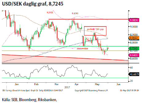 Om inte ett ordentligt rally inträffar under de sista timmarna av maj (stängning över 8,8385) så har vi i år inte följt det normala säsongsmönstret av en stigande dollar under månaden maj. Lättnaden efter det franska presidentvalet, bättre ekonomisk statistik från euro-området och osäkerheten runt President Trump har gett euron medvind. Medvinden har dock varit starkare för EUR/USD än för EUR/SEK varför USD/SEK fallit. Vi ser dock vissa tecken på köpande under februaribotten, 8.6970. Ett tidigarelagt Italienskt val (spekulationer om september) kan också komma att tynga euron.