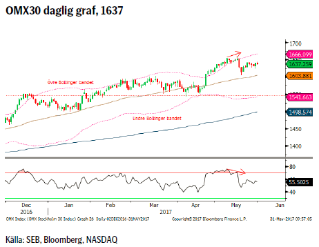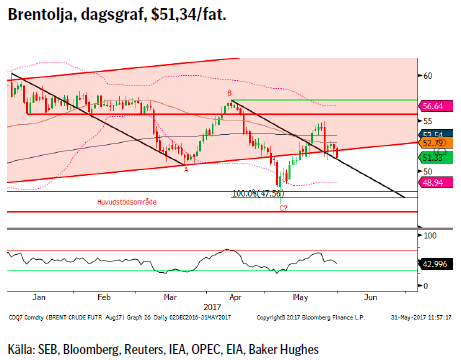 Råvaror: Så har vi då klarat av OPEC mötet och de signaler som sänts ut från framför allt Saudiarabien och Ryssland visade sig materialiseras i en nio månaders förlängning av avtalet från 30:e november. Att man valde att förlänga till utgången av första kvartalet 2018 och inte bara fram till årsskiftet 2017/18 beror sannolikt på att säsongsmässigt så är första kvartalet relativt svagt och att man därför försöker undvika lageruppbyggnad. Marknadens negativa reaktion visar dock att man sannolikt tolkat Saudiarabiens uttalanden om att göra vad som behövs (”whatever it takes”) som ev. större nedskärningar och inte bara en förlängning, vilket fick priset på fall när så inte blev fallet. Den svagare dollarn och ökad risk för en konflikt på Koreahalvön har lyft guld och silverpriset. Basmetallerna har handlat blandat med koppar och nickel fortsatt på den svaga sidan medan aluminium handlats upp till nära tidigare toppar. Zink har gjort en möjlig vändning uppåt och ser potentiellt spännande ut. Kaffe fortsätter med att försöka bygga en bas för en framtida uppgång medan socker och sojabönor fortsatt att handlas lägre. Elpriset (kvartal 3-terminen) är möjligtvis på väg att bryta upp ur konsolideringen som varat sedan toppen i november förra året.