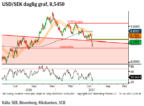 Riksbanken tog som förväntat bort de tre sista punkterna i sin räntebana som nu är helt plan, -0,50 %, fram till kvartal 3 2018 då prognosen säger -0,40 %. Inte förrän kvartal 2019 förväntas räntan krypa upp över nollan. Samtidigt flaggar man för ytterligare obligationsköp vid behov. Så full fart på stimulanserna samtidigt som USA fortsätter att höja bör kunna stödja en återhämtning av USD/SEK kursen. Vi skulle dock behöva klättra upp över motstånd runt 8,62 och 8,69 för att också få mer bevis att köparna återvänt och inte bara för att ta vinst på korta positioner.