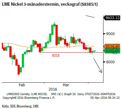 Nickelpriset har sedan förra veckan fortsatt att falla och har nu också brutit vad vi anser vara det viktiga 8315-stödet. Fundamentalt så har ingen ny information tillförts varför vi anser att priset just nu drivs mer av tekniska faktorer såsom en generell svaghet inom råvarusektorn.