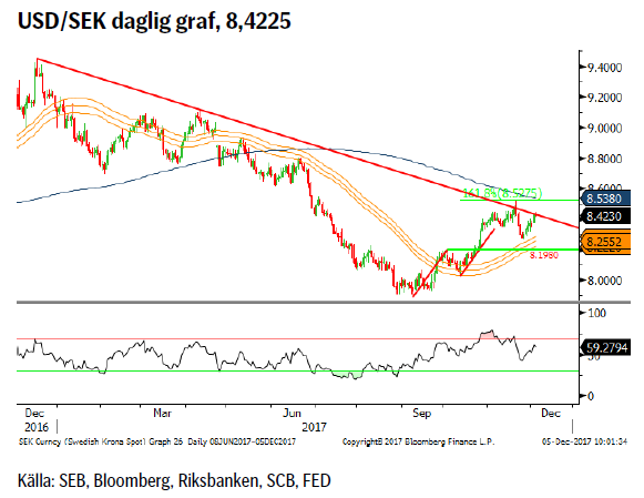 PPM-flöden där majoriteten av de 39,5 miljarderna placeras i utländska tillgångar, godkännandet av det amerikanska skattepaketet samt den kommande amerikanska räntehöjningen (13/12) har eldat på USD/SEK genom både starkare dollar och svagare krona. Även oron på den svenska bostadsmarknaden är på marginalen en SEK negativ faktor (EUR/SEK i skrivande stund åter över 10:an).