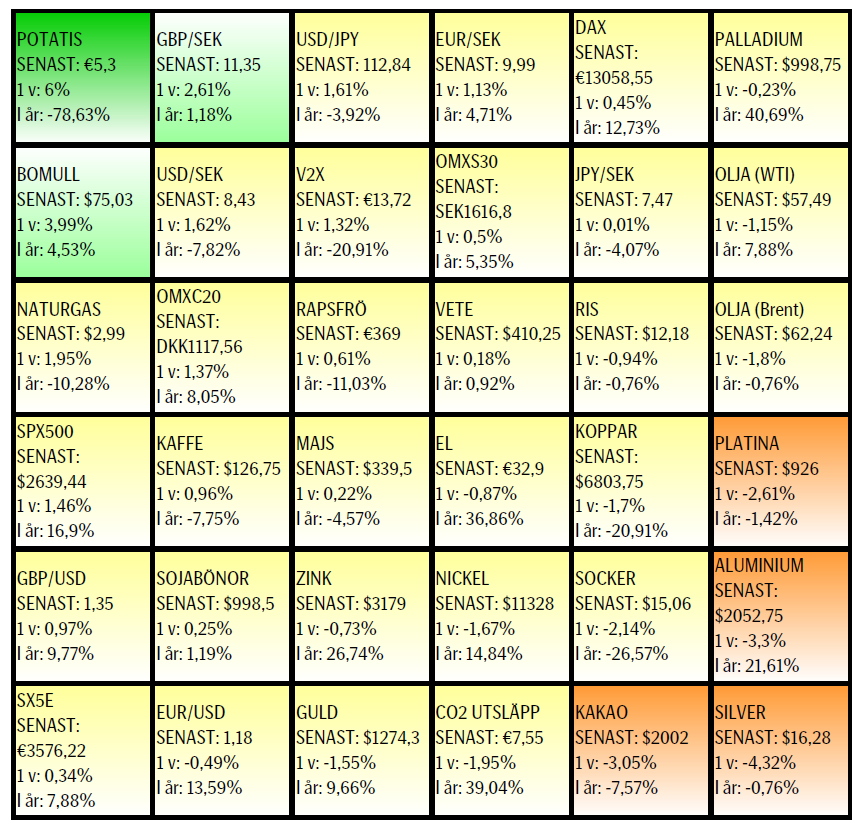Råvaror: Beskedet om att OPEC/icke OPEC redan nu bestämt sig för att förlänga innevarande produktionsbegränsningar mottogs inte med några större kursrörelser i oljepriset. I princip kan man nog säga att de förlängda begränsningarna fick tummen upp av innehavarna av långa terminskontrakt då nära nog ingen vinsthemtagning noterats. Det är också intressant hur samarbetet mellan Ryssland och Saudiarabien utvecklats och förstärkts vilket ger ytterligare tyngd till överenskommelsen. Det finns dock starka krafter i Ryssland (där ju oljeindustrin till skillnad mot Saudiarabien inte är statlig) för att öka produktionen. Kanske kontrollpunkten i juni kan vara ett tillfälle för Ryssland och övriga icke OPEC att hoppa av? En sådan utveckling skulle också göra att den olja som så småningom ska tillbaka till marknaden kan gör så än mer gradvis. Basmetallerna har fortsatt korrektionerna nedåt ledda av nickel och aluminium som också gav negativa månadssignaler. Kinesiskt stål har stigit kraftigt och nått nivåer vi inte sett på cirka tio år. Ädelmetaller fortsätter att befinna sig i bakvattnet. CO2 glider nedåt.