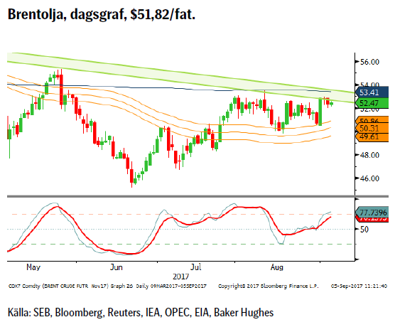 Nu när det ser ut som om Harvey inte satt allt för stora spår i amerikanska raffinaderier så har vi Irma på ingång. Oljeproduktionen i gulfen drabbades inte alls av den senaste orkanen så priset åkte ned när det såg ut som om raffinaderierna inte skulle kunna ta emot leveranser och nu åter upp när de ser ut att kunna. Saudiarabien exporterade i augusti den minsta mängden olja sedan 2010 (de bränner ca. 400k fpd extra under sommaren för el till luftkonditionering). Man har också höjt sina OSP (Officiellt Sälj Pris) för alla kvaliteter för leverans i oktober till Asiatiska köpare. Ryssland och Saudierna har också släppt en försöksballong om att ytterligare förlänga produktionsbegränsningarna ytterliger tre månader dvs till sista juni 2018.