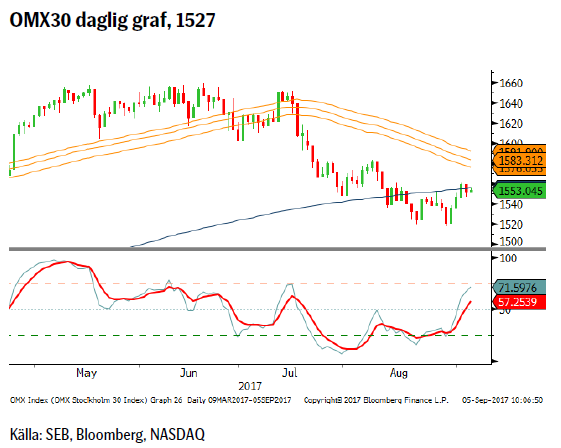 + Tekniskt så är det positivt att vi åter är över 55d mv bandet och 233d mv samt trendlinjen från toppen 2011.