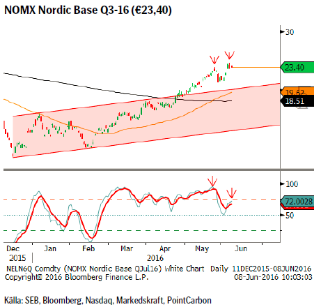 Råvaror: Oljeprisuppgången närmar sig nu 90 % från botten i vintras vartefter balanseringen mellan utbud och efterfrågan framskrider. Dock är en hel del av minskad produktion att härröra till vad som är temporära faktorer (skogsbränderna i Kanada, attentaten i Nigeria m.fl.). Efterfrågan fortsätter dock också att öka och den senaste statistiken (Kv. 1) visar att Indien nu övertagit ledartröjan från Kina avseende ökad efterfrågan (+400,000 fpd). Ädelmetaller rusade efter att sannolikheten för en amerikansk räntehöjning åter skjutits på framtiden. Industrimetaller har det lite tyngre och även en favorit som zink ser ut att ha gått lite för fort. Sojabönor och sojamjöl, två raketer i år, visar också vissa utmattningssymtom. Vår BULL MAJS X4 S har sedan förra veckan nått vinsthemtagningspunkten och är följaktligen stängd. Kaffe fortsätter att bygga på en eventuell bas.