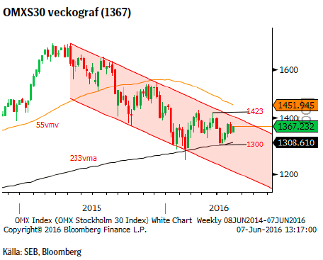 – Vid tidigare tillfällen, 2001 och 2008, när marknaden ”hängt” på 233vmv för att sedan falla under detta har utlöst kraftiga utförsäljningar varför stödet vid 1300 får anses vara viktigare än motståndet vid 1423/31.