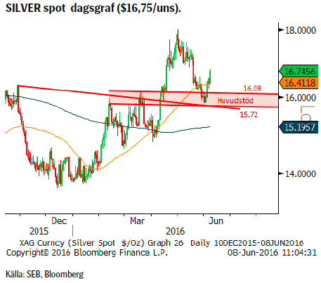 Den svaga amerikanska jobbrapporten (NFP) i fredags stängde effektivt dörren för en räntehöjning i juni (och möjligtvis också i juli) vilket mer eller mindre bekräftades av Yellens tal i måndags. Följaktligen har dollarn tagit en del stryk då ränteförväntningarna (och långa räntor) pressats ned. Den svagare dollarn har också åter gett luft under vingarna till guld och silver som båda lyfte från respektive metalls stödområde. Nästa huvudsakliga event blir nu Brexit-omröstningen (23/6) där de senaste opinionsundersökningarna nu visar på medvind för lämna-sidan. Brittiska bookmakers håller dock inte med utan pekar på ~72 % sannolikhet för att förbli kvar inom EU.