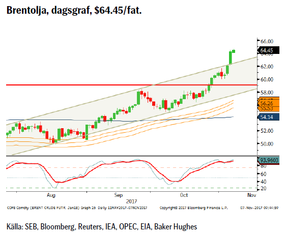 Råvaror: Oljepriset har fortsatt att stiga och det senaste klivet uppåt utlöstes av helgens arresteringar i Saudiarabien. Risken för en maktkamp inom det Saudiarabiska kungahuset och/eller de olika klanerna har helt klart ökat. Även det faktum att USA verkar ha slagit i taket för sin exportkapacitet, vilket den kraftigt ökade skillnaden mellan WTI och Brentoljorna pekar på, har hjälpt till att pressa Brentpriset högre. Nordiska elpriser verkar ha avslutat en period av lite lägre priser. Prognoser om en kallare än normal vinter kan ha hjälpt till men framför allt så uppvisar kontinentala elpriser fortsatt styrka. Utsläppsrätter fortsätter, efter en kortare paus, att handla högre. Basmetallerna, framför allt nickel, steg, sannolikt på baksidan av generellt positiva rapporter under LME veckan. Förutom nickel så verkar dock de andra metallerna möta säljare vid nuvarande nivåer. Arabicakaffet har så sakteliga börjat attrahera lite köpande, en indikation om ett färdigt fall? Skillnaden mellan platina och palladium fortsätter att sätta nya rekordnivåer då marknaden köper palladium och säljer platina utifrån antagandet att dieselbilar fasas ut snabbare än bensinditon.