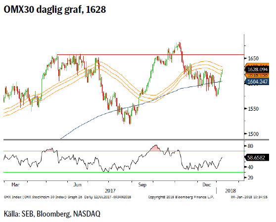 Börser: Amerikanska börser har fortsatt att gå från klarhet till klarhet, understödda av den amerikanska skatteöverenskommelsen. Europeiska dito understödjs å andra sidan av god ekonomisk statistik och t.ex. DAX ser nu, efter det misslyckade försöket under 12,810, ut att åter vara på väg mot nya toppar. OMX har det dock fortsatt lite jobbigt och släpar långt efter de andra.
