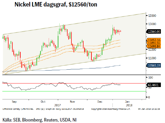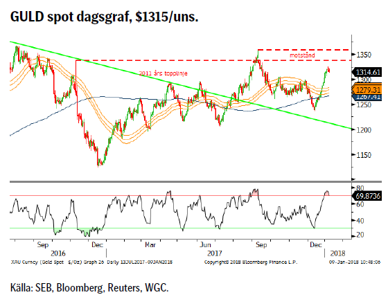 Råvaror: Energi och metaller hade ett bra 2017 medan jordbruksprodukter i huvudsak tappade i pris. Sedan senast så har oljepriset fortsatt att stiga, dock från ett redan överköpt läge varför risken för rekyl nog inte ska underskattas. Den spekulativa långa nettopositioneringen har nått nya höjder och lär nog fortsätta göra så tills prisutvecklingen vänder nedåt. Skeendet inom det Saudiska kungahuset och utvecklingen i Iran lär dock kortsiktigt fortsätta att kasta sin skugga över oljepriset. Riskpremien bör dock beaktas om situationen nu skulle lugna ned sig. Metallerna, både industri och ädel dito, har börjat året starkt men framför allt aluminium uppvisar vissa utmattningstecken. De kinesiska åtgärderna, neddragningar av smältverk, för renare luft har givit effekt och luften i Beijing är den bästa på fem år. Vinteråtgärderna kommer till ända senast den 15 mars så ökad aluminiumproduktion bör följa.