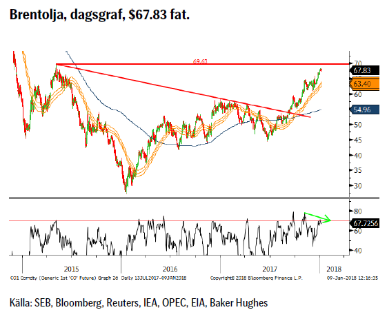 – Tekniskt så riskerar vi nu en negativ divergens dvs. vi har en ny topp i oljepriset men än så länge en lägre topp i RSI.