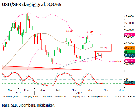 Varken FED eller presidentvalet i Frankrike bjöd på några överraskningar vilket fick marknaden att ytterligare handla ned volatilitet/riskpremier, VIX indexet stängde t.ex. på måndagen på sin lägsta nivå sedan december 1993. Beredskapen mot negativa överraskningar är följaktligen mycket låg. Nästa osäkerhetsmoment i Frankrike är parlamentsvalen i juni och frågan är hur President Macron ska kunna hinna nominera kandidater till dessa. Arbetslöshetsstatistiken från USA i fredags visade på en fortsatt god arbetsmarknad vilket ökar sannolikheten för en räntehöjning i juni.