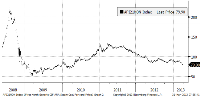 Kolpriserna som styr priset på el på längre sikt har däremot gått i motsatt riktning, som vi ser i ett femårsdiagram nedan. Priset är i dollar per ton.