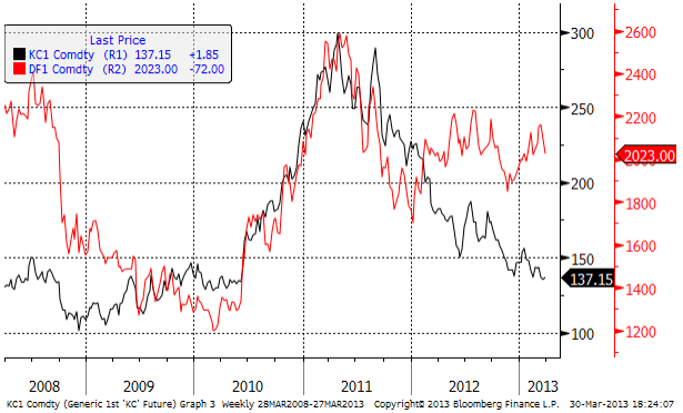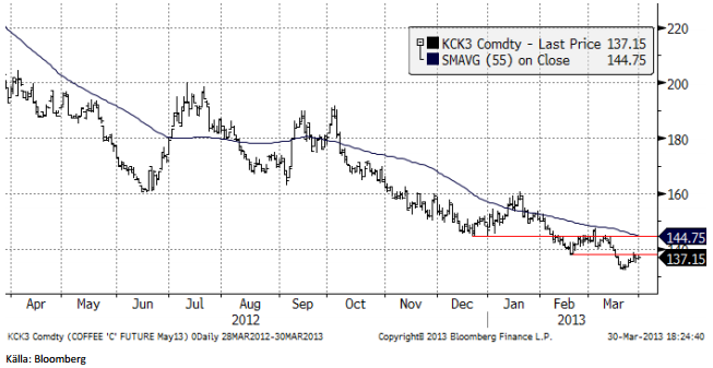 Kaffepriset (maj 2013) har rekylerat upp till vad som tidigare varit ett stöd och nu är ett motstånd. Priset på Arabica ”borde” vara på väg att vända upp, men vändningen har dröjt. Vi väntar med köprekommendation till dess vi sett något tydligare tecken på att trenden kan ha vänt. Den har inte gjort det än.