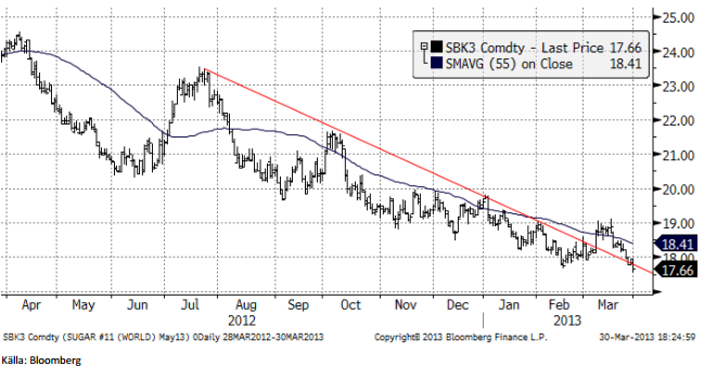 Sockerpriset (maj 2013) har också fortsatt att falla. Det såg ut som ett försök till trendvändning i mars, men detta vändes i sin motsats.