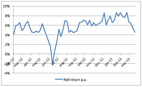 Det betyder också att rullningsavkastningen man får genom att vara köpt olja via terminer har minskat. Å andra sidan har spotpriset blivit billigare, så det jämnar ut sig. Nedan ser vi roll returns mellan andra och fjärde positions terminskontrakt på Brent som har minskat den senaste månaden. Med andra positions terminskontrakt menas det terminskontrakt som förfaller om två månader och med fjärde position, det som förfaller om fyra månader.