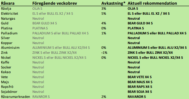 *) Avkastningen avser 1:1 råvarucertifikat där de ingår i rekommendationen. I den aktuella tabellen ovan har jag tagit prisförändringen den senaste veckan sedan det förra veckobrevet publicerades.