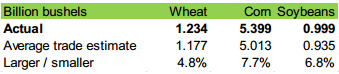 Lagren av vete, majs och sojabönor var per den 1 mars betydligt högre än vad marknaden förväntat sig, som vi ser i tabellen nedan.