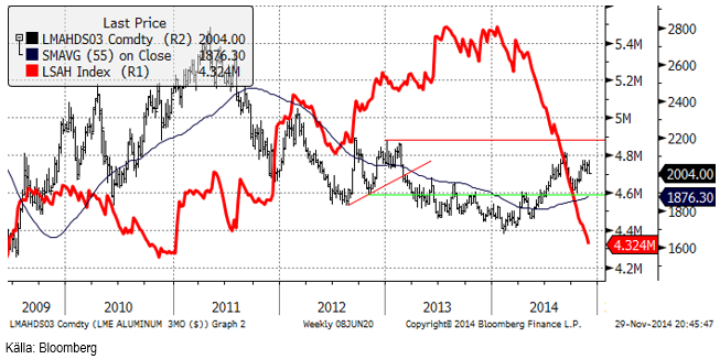 Aluminiumpriset var förbluffande stabilt i veckan, trots att energi är en så stor del av produktionskostnaden och priset på olja föll så kraftigt. Vi tror inte att prisfallet på olja kommer att gå helt obemärkt förbi och väljer därför att gå över till neutral rekommendation.