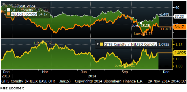 Nedan ser vi kvoten mellan priset på terminen för tysk el under första kvartalet och terminen för nordisk el för samma kvartal. Tysk el har inte fallit i pris på samma sätt under hösten som nordisk el har gjort, utan snarare gått upp något lite.