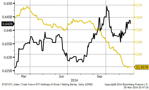 Institutionella investerare äger via ETF/ETC-er 51.96 miljoner uns guld och det är faktiskt mer än de gjorde för en vecka sedan, när de ägde 51.91 miljoner uns. Däremot har de faktiskt netto sålt lite silver.