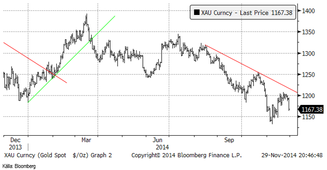 Prisfallet på olja och det viktiga beslut som (inte) fattades vid OPEC-mötet, fick guldpriset att falla ytterligare. Det finns två anledningar till varför med anledning av oljepriset. För det första ger ett lägre oljepris en kraftig boost för ekonomierna i Tyskland, Frankrike och USA. Det är länder som använder olja för att tillverka andra varor och sälja dem. Vinsterna stiger i näringslivet i dessa länder och det minskar risken för att via inflation behöva inflatera bort skulder. För det andra är kostnaden för olja och annan energi en betydande andel av kostnaden för att producera guld i gruvdrift. Det är djupa gruvor och det är låga halter med mycket malm att krossa för att få fram metallen.
