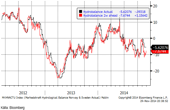 Hydrologisk balans har enligt 2-veckors prognosen stigit med 1 TWh.