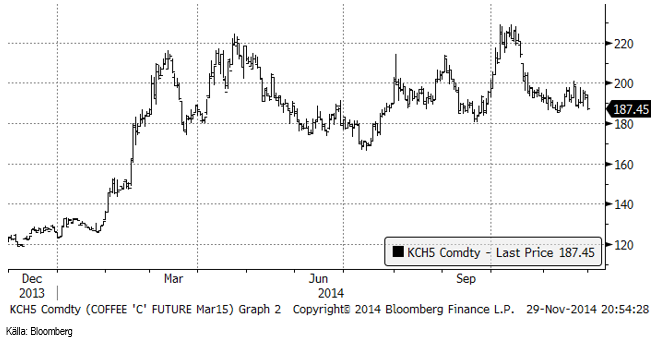 Kaffepriset (mars) har backat med ett par cent sedan förra veckan. Den brasilianska valutan försvagades i spåren av oljeprisfallet. Djuphavsoljan som varit Brasiliens stora hopp, kostar ca 90 dollar per fat att få upp från 3 km djup under havsytan och den är värdelös vid dagens prisnivå – och den prisnivå som troligen kommer att råda under överskådlig framtid.