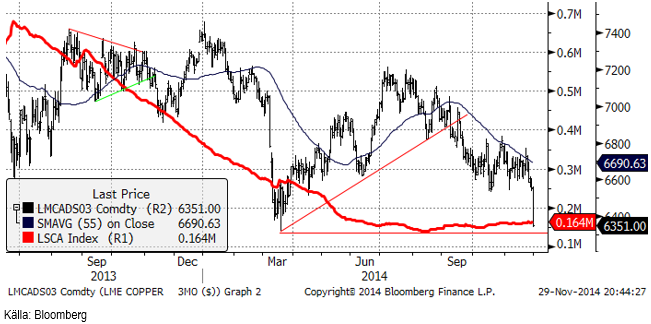 Priset på koppar föll kraftigt i fredags. Dels påverkade prisfallet på olja negativt. Priset på olja (energi) är en stor del av produktionskostnaden för koppar. Dels visade ny statistik från Chile att produktionen i landet inte minskar, utan istället låg på den högsta nivån på fem månader under oktober.