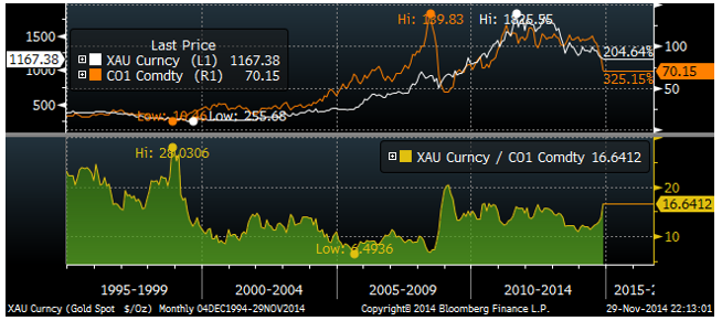 Vi ser kvoten mellan guld och olja nedan. Relationen har alltså stigit ganska kraftigt den senaste tiden och ligger i ett historiskt perspektiv ganska högt. Ytterligare oljeprisfall borde därför dra med sig guldpriset nedåt.