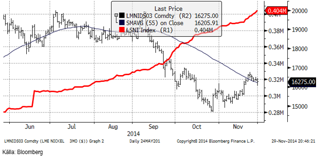 Nickelpriset föll lav ganska kraftigt i veckan. Nickel används mycket i olje- och gasindustrin. Man kan tänka sig att olje- och gasindustrin i USA går in i ett lite lugnare skede efter oljeprisfallet och det bör tynga nickelpriset. Lagernivån vid LME fortsätter också att stiga, vilket gör att marknaden är känslig för negativa signaler. Vi väljer därför att gå över till neutral rekommendation på nickel.