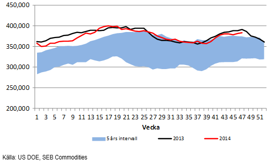 Lagren i USA ökade med 2 miljoner fat enligt DOE:s statistik i veckan.