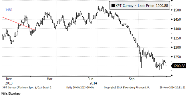 Platina föll, liksom guld och silver kraftigt i veckan, ner till 1200 dollar, som för platina fortfarande är en teknisk stödnivå.