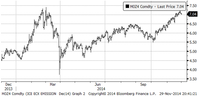Priset på utsläppsrätter steg i veckan från 7 till 7.04, men var uppe på 7.14 som högst.