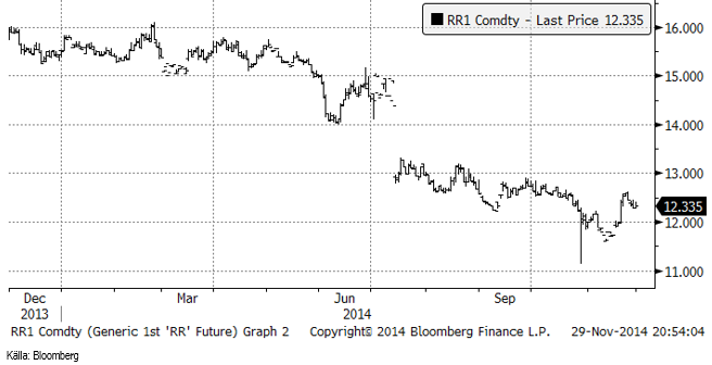 Nedan ser vi terminskontraktet för leverans av kol under 2015, som sjunkit från 72.55 dollar per ton till 72.10 i fredags. Tendensen var svag när handeln stängde för veckan.