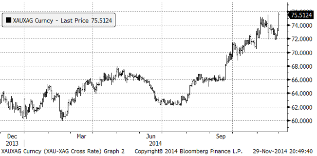 Silver nådde en ny bottennivå i relation till guld. Priset på guld i silvertermer nådde med andra ord en ny toppnivå.