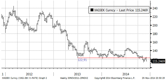 Silverpriset vände ner, precis där det i priset i kronor fanns ett starkt motstånd. Vi skrev om det som ett säljtillfälle förra veckan. Silverpriset kommer antagligen att falla ner till en ny årslägsta notering.