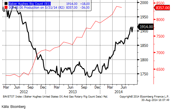 Oljepriset har brutit motståndet för den nedgång som varit sedan juni. Vi tror att det finns potential för uppsida och det motiveras bland annat av att OPEC har producerat maximalt och det finns en viss sårbarhet med ISIS som motor i MENA. Libyen känns också skakigt då t ex den amerikanska ambassaden i Tripoli intogs i helgen. Slutligen har vi Ryssland/Ukraina-krisen och vinter på norra halvklotet på väg.