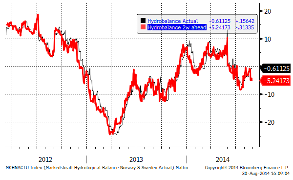 Hydrologisk balans har enligt 2-veckors prognosen försvagats.