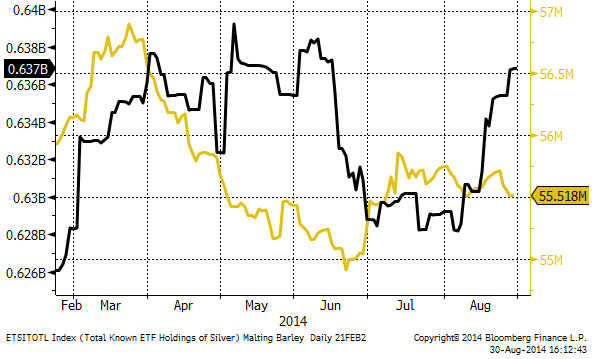 Nedan ser vi att det varit inflöde i guldfonder (gul kurva, antal uns i ETF:er) under den senare delen av augusti. Vi har även märkt av att svenska placerare köpt guld, inte bara GULD S utan även fysiskt guld, vilket vi kan hjälpa till med för våra private bankingkunder.