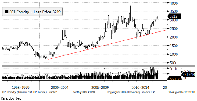 Det är inga större nyheter på kaffefronten. Tekniskt ser vi att priset på decemberkontraktet tagit sig upp till 200 cent. Möjligen kommer priset att gå upp till 220 cent, där ett starkt motstånd finns. Fundamentalt ser vi dock inte något som talar för högre pris på kaffe.
